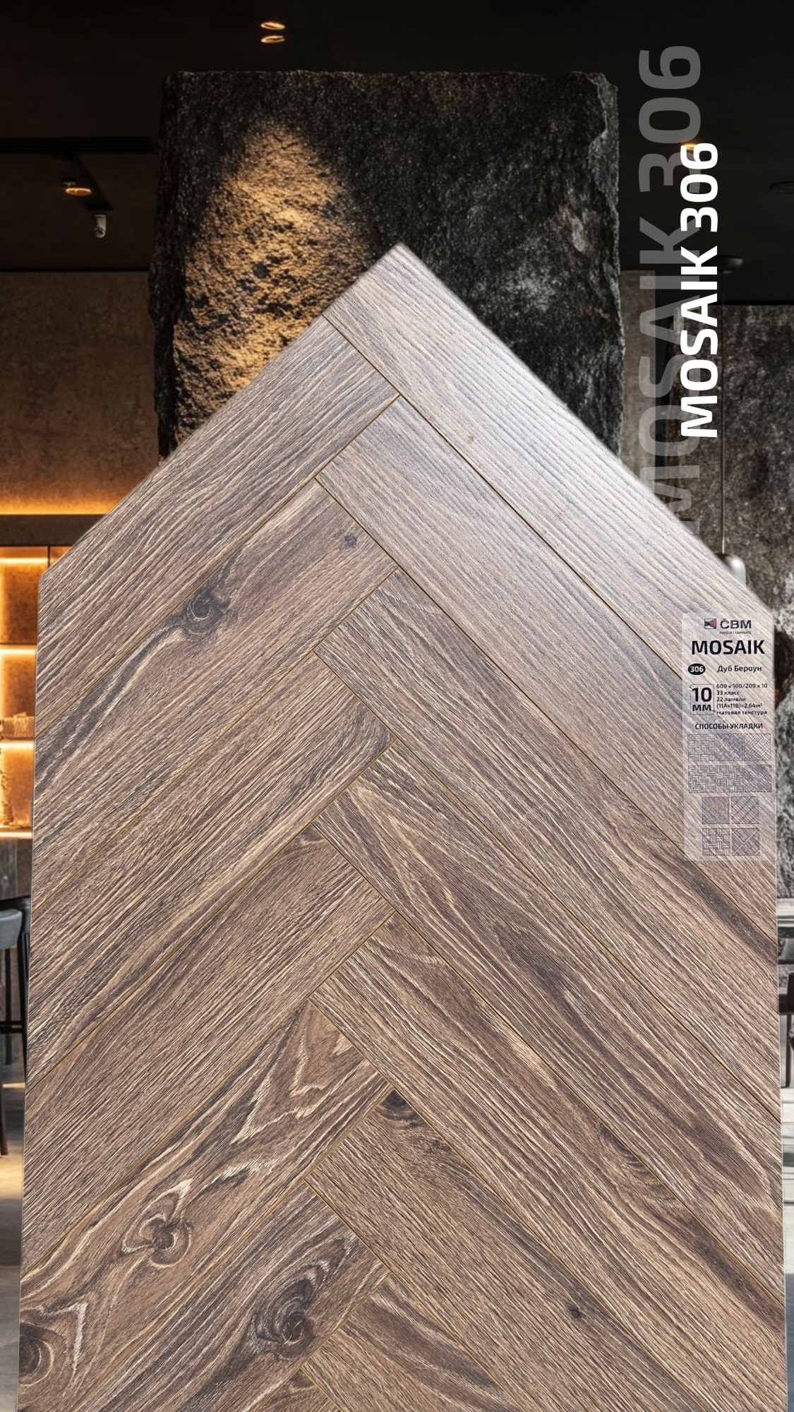 Страна производства Чехия Коллекция Mosaik Класс пожарной опасности КМ 3 Производители ламината Cbm Класс ламината 33 Толщина доски ламината 10 мм Размеры доски ламината 600х100 мм Вид\Имитация материала Ёлочка Упаковка ламината 2,64 м2, досок (22А+22В), 23,4 кг. Наличие фаски ламината 4х-сторонняя Влагостойкость ламината Повышенная Срок эксплуатации ламината (в домашних условиях) 25 лет -