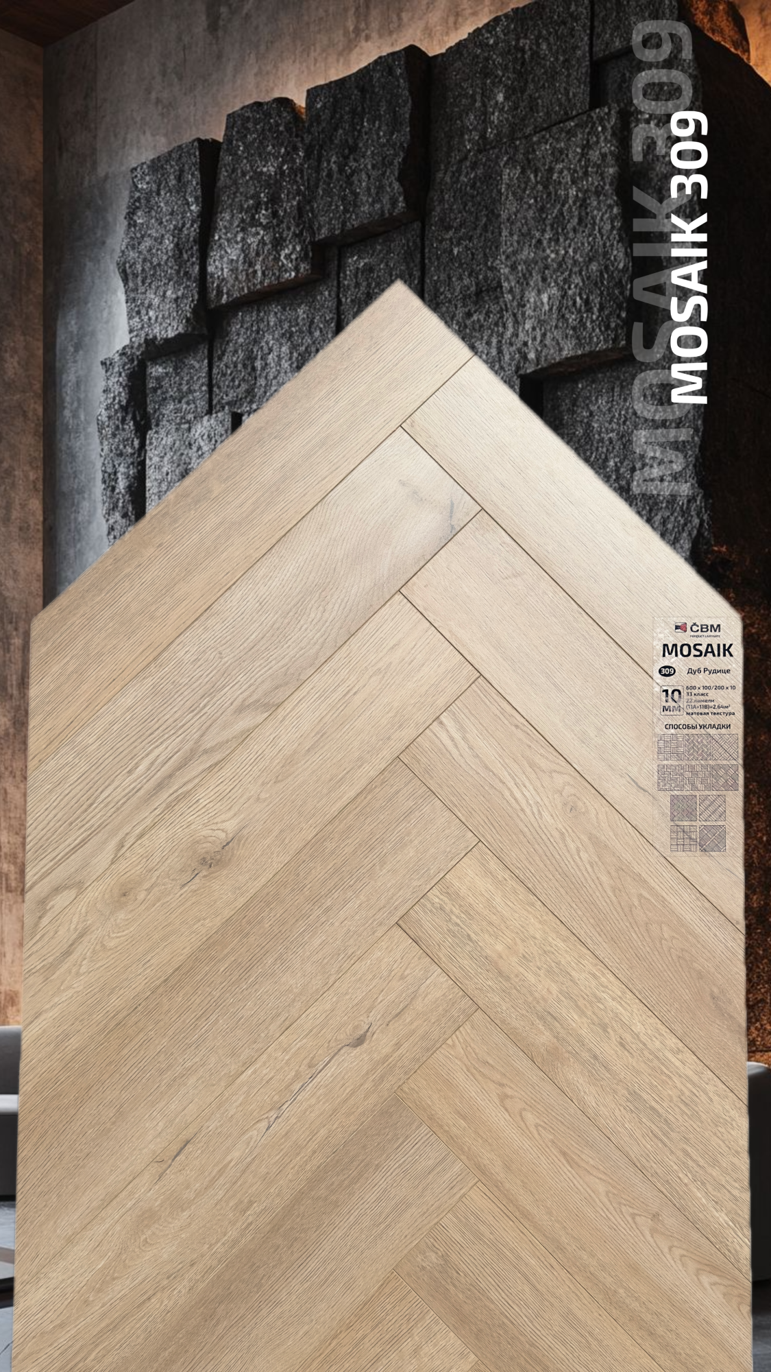 Страна производства Чехия Коллекция Mosaik Класс пожарной опасности КМ 3 Производители ламината Cbm Класс ламината 33 Толщина доски ламината 10 мм Размеры доски ламината 600х100 мм Вид\Имитация материала Ёлочка Упаковка ламината 2,64 м2, досок (22А+22В), 23,4 кг. Наличие фаски ламината 4х-сторонняя Влагостойкость ламината Повышенная Срок эксплуатации ламината (в домашних условиях) 25 лет -